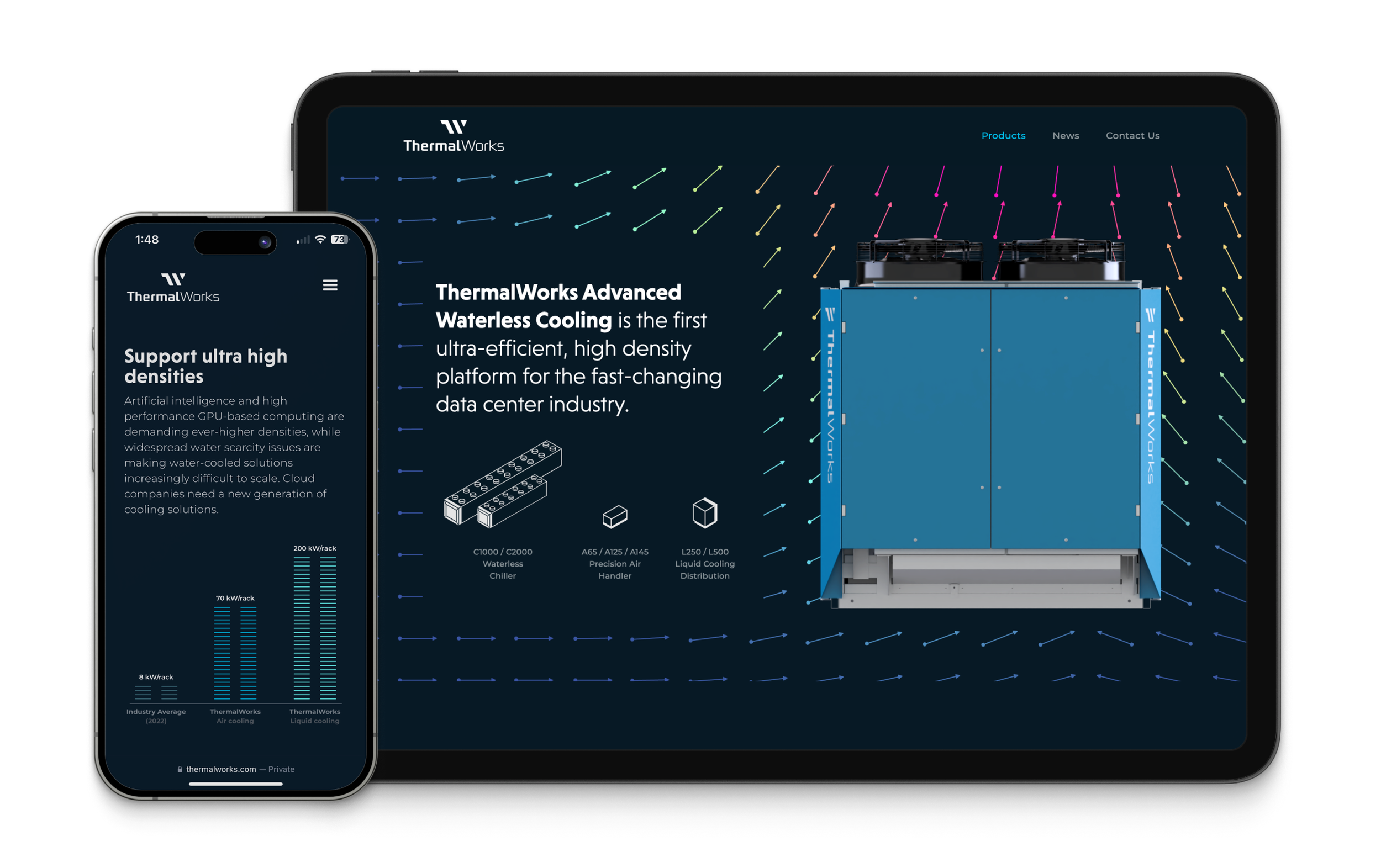 Brand Identity + designed the ThermalWorks Advanced Waterless Cooling website, showcasing the first ultra-efficient, high-density waterless cooling system built for the fast-changing data center industry.